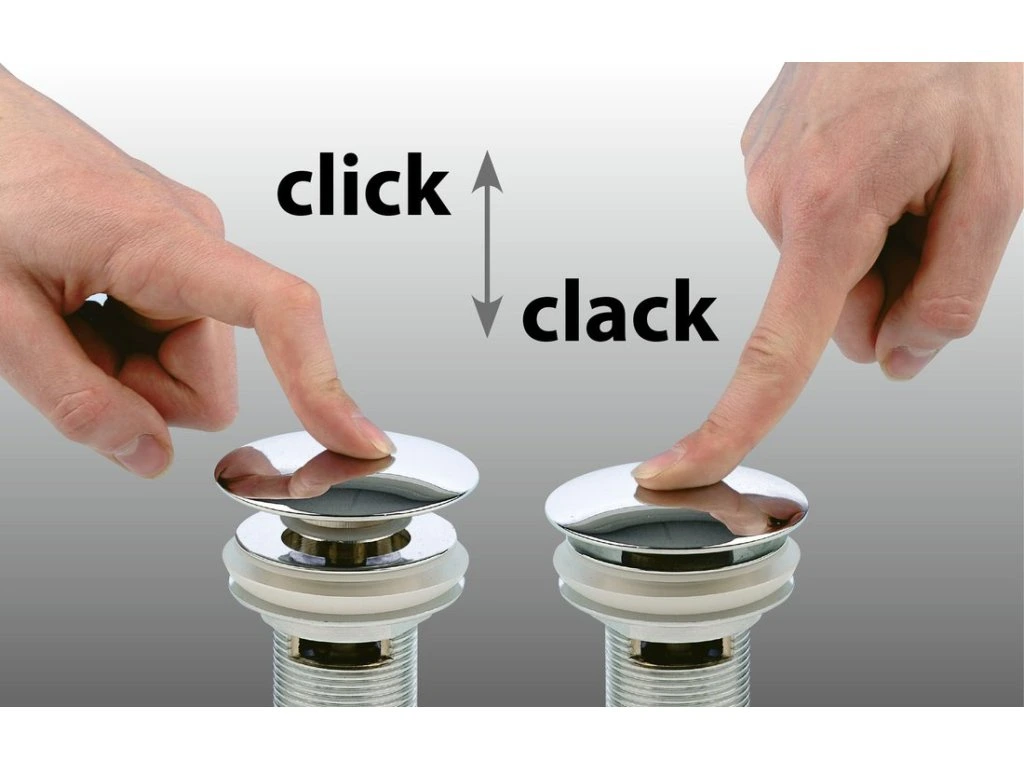 Jedná se o moderní variantu mechanismu uzavírání výpustí do umyvadel a van. Již nemusíte přemýšlet, kam odložit gumovou zátku, nebude překážet řetízek, odpadne nepohodlné ovládání zátky pomocí táhla u baterie. Systém Click Clack je ovládán pouhým stlačením zátky.