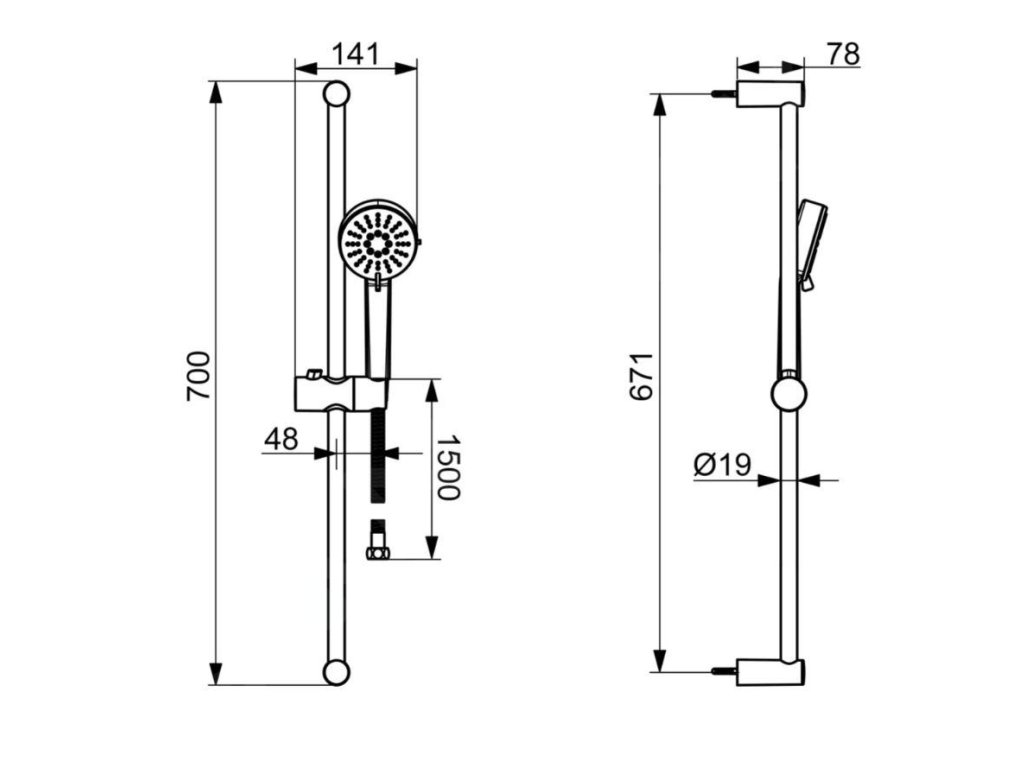 Sprchový set se 3 funkcemi. Uvedená délka výrobku je 70 cm. Průtok 11,4 litrů/minutu.