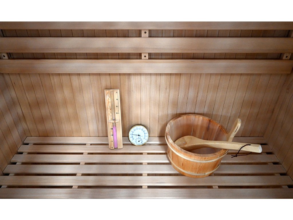 Kamna a další příslušenství nejsou součástí sauny, je nutno dokoupit zvlášť. Doporučujeme dokoupit kamna o síle 2,3-3,5 kW. Například SAWO mini 3,6 kW.