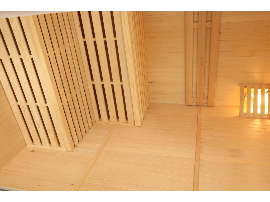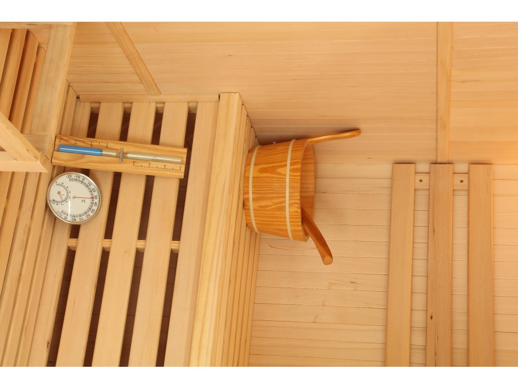 Kamna a další příslušenství nejsou součástí sauny, je nutno dokoupit zvlášť. Doporučujeme dokoupit kamna SENTIOTEC VIKING o síle 4,5 kW nebo 6 kW.