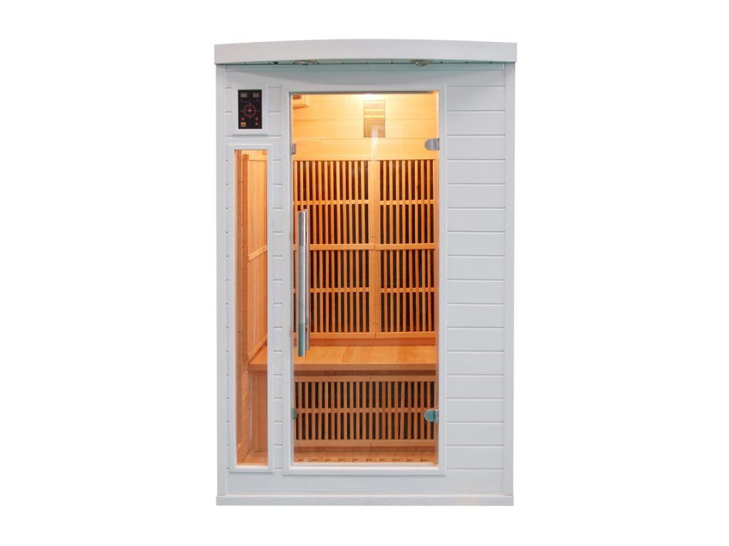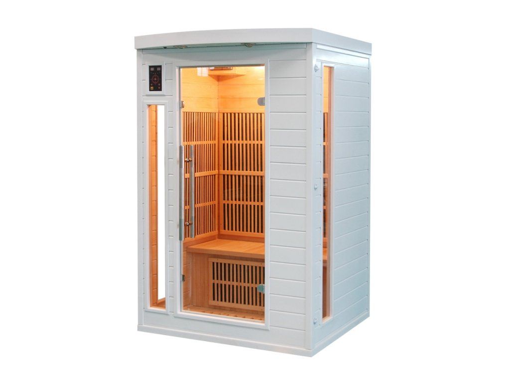 Domácí infrasauna Soleil Blanc 2 předního saunového specialisty FRANCE SAUNA je určená pro dvě osoby a je vyrobena z kanadského jedlovce v bílé barvě, aby snadněji zapadla do jakéhokoliv interiéru. O své zdraví můžete nyní pečovat i z pohodlí svého domu či bytu. Pobyt v infrasauně má spustu pozitivních zravotních a kosmetických účinků. Saunování má blahodárný vliv na kardiovaskulární systém, odstraňuje bolesti zad, kloubů a končetin, posiluje imunitní systém, odstraňuje nebo předchází celulitidě a zlepšuje kvalitu pleti. Při pobytu v infrasauně můžete poslouchat FM rádio nebo svou oblíbenou hudbu z MP3 přehrávače. Kvalitní uhlíkové infrazářiče zajišťují rovnoměrnější rozložení tepla v kabině, jsou úsporné a velice rychle vyhřejí saunu na požadovanou teplotu. Infračervené panely jsou optimálně umístěny na stěnách, na lavici a pod podlahou, aby teplo pronikalo do celého těla.