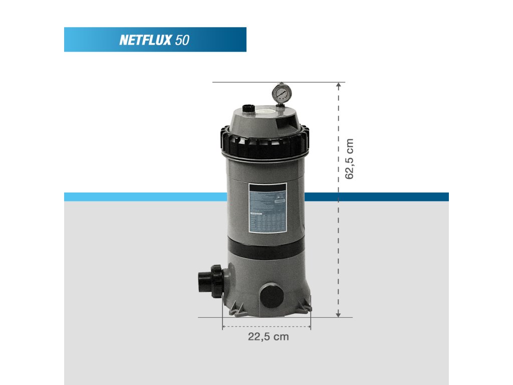 Filtr Netflux je také vybaven vysoce kvalitním tlakoměrem, který poskytuje jasný přehled o provozním tlaku. Tato funkce umožňuje snadné sledování stavu filtru a rychlý zásah v případě potřeby, čímž je zajištěna optimální filtrace vody ve vašem bazénu nebo vířivce.
