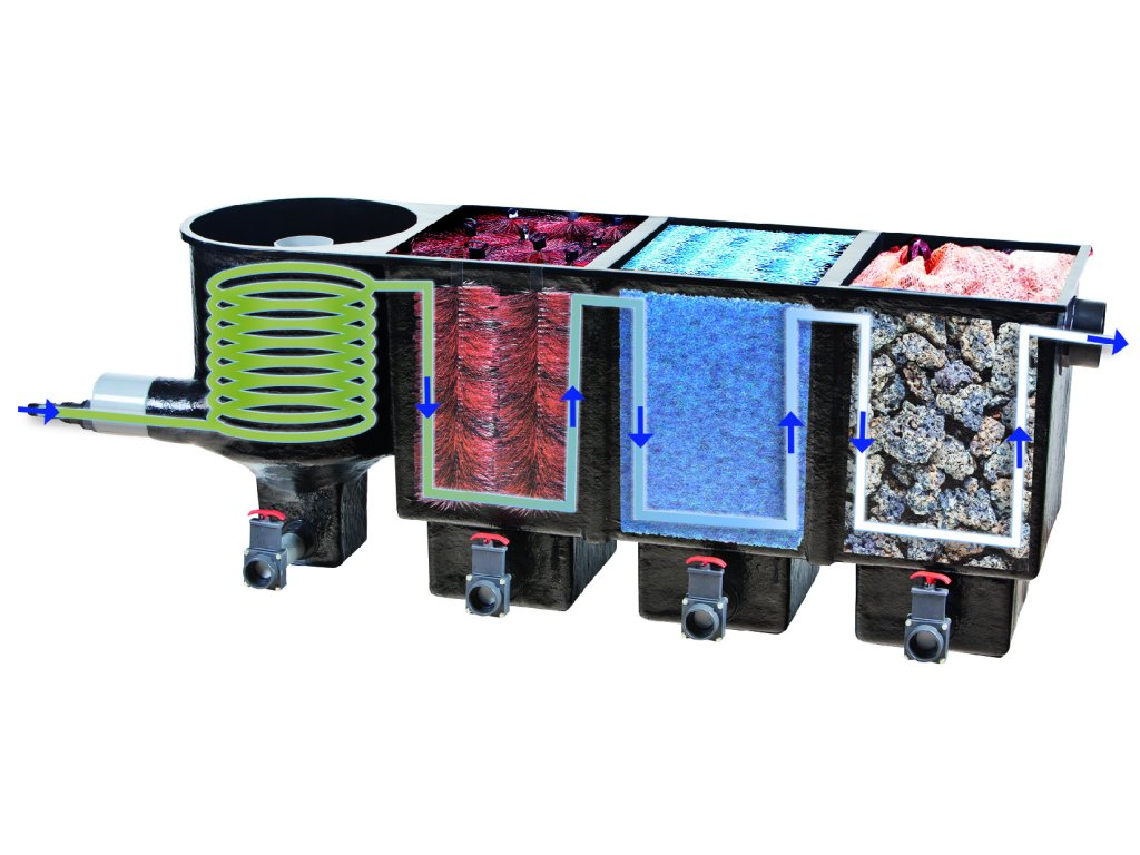 Rychlý návod postupu výstavby(detailní postup najdete v přiloženém podrobném návodu):Co potřebujete:kolečko (popř. minibagr), měřící lať, rýč, lopata, vodováha, metr, zahradní hadice, písek, velké i malé oblázky, dekorativní kameny, jezírkové rostliny a substrát.Určit místo:vyznačte obrys jezírka pomocí zahradní hadice, písku nebo spreje. Podél vyznačeného jezírka vyryjte zeminu a odložte ji vedle (hodí se na finální dekoraci).Začněte s hloubením:vytvořte bahnitou zónu (0–15 cm), pobřežní mělkou zónu (15–50 cm) a hlubinnou zónu (od 50 cm). Spád jednotlivých zón by neměl překročit 30°.Úprava okrajů a břehu:všechny okraje musí být v rovině – zkontrolujte měřící latí a vodováhou. Pro vyrovnání použijte zeminu z výkopu.Položte geotextilii a fólii:naneste 10 cm vrstvu písku na všechny plošky, vyrovnejte a položte geotextilii. Poté rozprostřete fólii od středu jámy a přetáhněte ji přes okraj. Vytvořte kapilární závěr žlábkem vyplněným oblázky nebo štěrkem.Umístěte čerpadlo:čerpadlo dejte na opačnou stranu od filtračního systému pro přirozenou cirkulaci vody. Hadici a kabely veďte bezpečně, aby nedocházelo k posunu čerpadla.Naplňte jezírko vodou:po vyrovnání fólie osaďte rostliny, umístěte techniku a naplňte jezírko vodou. Po 24 hodinách odstřihněte přečnívající fólii a dokončete okraje dekorativními kameny.Video návod na UV lampu: