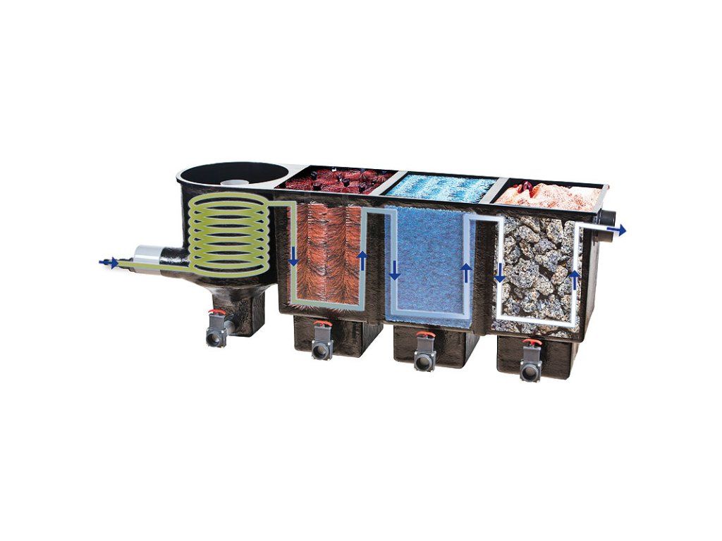 Jezírkový filtrační systém Heissner pro čistou a jasnou vodu ve vašem jezírku. Firma Heissner má více jak 100 let zkušeností s filtračními systémy od tlakových po průtokové a podvodní filtrace. Filtrační systém jednoduše zvolíte dle objemu Vašeho jezírka. Profi průtoková filtrace Heissner F322-00, používá léty osvědčenou konstrukci, velká odstředivka odloučí hrubé i jemné nečistoty. Pak voda pokračuje do dalších komor, které jsou vyspádované a pro snadné čištění má každá svůj vlastní odkalovací ventil. Profi venkovní filtr Apollo může být umístěn vedle jezírka. Je dodáván se všemi filtračními médii a přípojkami. Nejdříve se voda filtruje v první komoře přes odstředivku Vortex, kde se zbaví všech hrubších nečistot před vstupem do biologické části jezírkové filtrace. Nátok vody z jezírka je uprostřed výšky odstředivky a je zaústěn excentricky tak, aby docházelo k rotaci vody. Přepad z odstředivky je v horní části, tak je zaručeno, že nečistoty rotují ve vodě a klesají, dokud se neusadí na dně. Dál voda pokračuje do komory se Sansai kartáči kde dojde k zachycení drobných nečistot. Kartáče jsou vybaveny očky pro snadné vyjmutí. V další části je umístěna filtrační japonská rohož, která slouží jako biologická filtrační plocha pro osídlení filtračních bakterií. V další komoře je speciální filtrační substrát, který se preventivně stará o čistou vodu v zahradním jezírku a podporuje dlouhodobé přirozené čištění vody. Váže škodliviny a přebytečné živiny a bakteriálně je odbourává. K filtraci je dodávány dva přípravky na úpravu vody. Odstraňovač fosfátu 1000 ml, odebere z vody živiny pro řasy. Startovací bakterie k urychlení vzniku biologického samočištění vody .Každá komora filtru je vybavena výpustí pro snadné odkalení.Odkalovací ventily je možné prodloužit za pomocí trubek DN 50 a výpusť do jezírka pomocí DN 125. Tím můžete filtraci umístit dále od jezírka.ParametryPro jezírka bez ryb do objemu 80 m³Pro jezírka s rybami do objemu 40 m³Pro jezírka s koi kapry 20 m³Doporučené čerpadlo HFP7000-00 7 000 l/h / 65 WDoporučená UV lampa F455X-00 55 WFiltrační média Sansai kartáče, japonská filtrační rohož, filtrační substrátOdstraňovač fosfátu 1000 gStartovací bakterie do jezírka 1000 mld x š x v 176 x 46 X 67 cmDoplňkové parametry