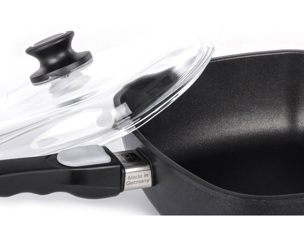 - Pánev je vhodná na všechny typy sporáků – na indukci, plyn i varnou desku nebo pro použití v troubě (po odejmutí rukojeti)