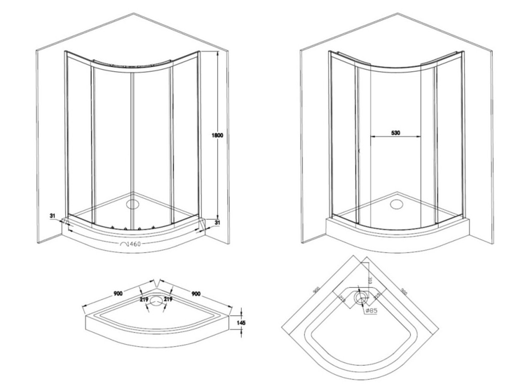 • Rozměr: 90× 90 × 194,5 cm - s vaničkou (šířka, délka, výška), výška zástěny bez vaničky 180 cm