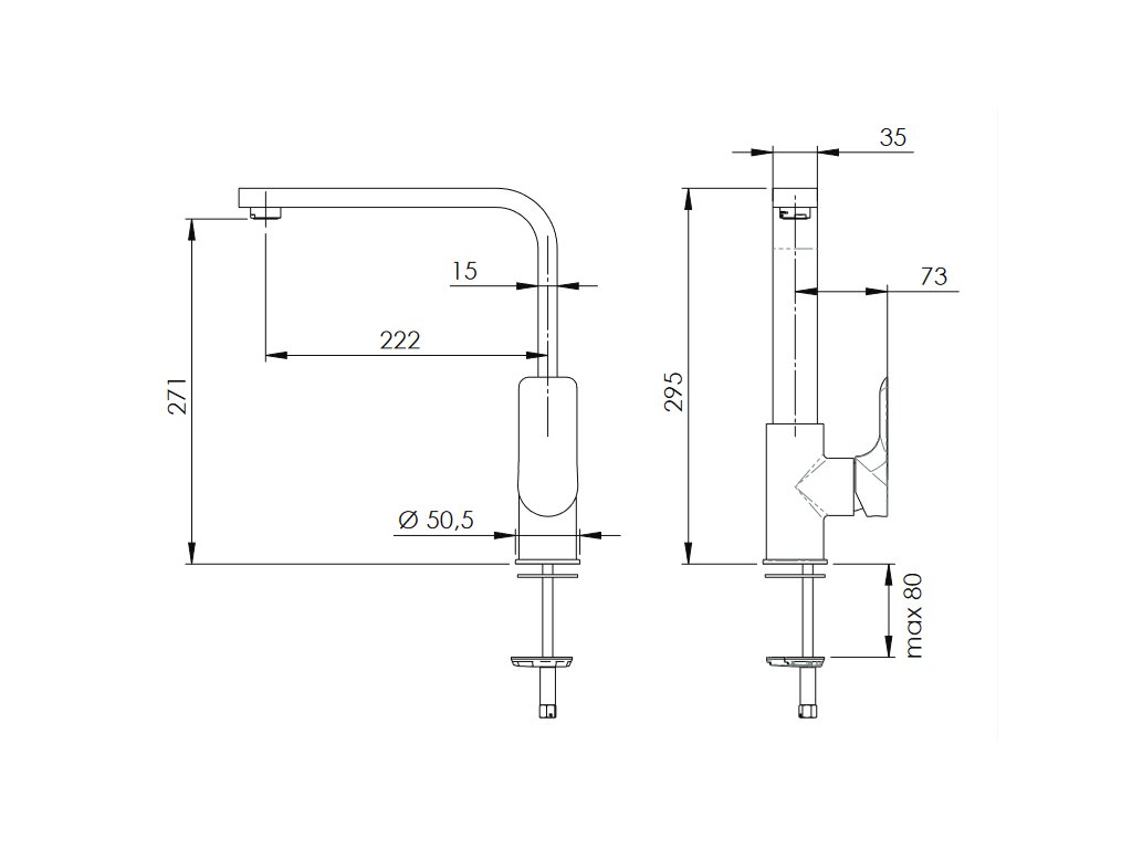 Dřezová stojánková vodovodní baterie ARNO 72Q představuje moderní design a kvalitu. Zahnuté ramínko s ostrými hranami jí dodává elegantní vzhled.