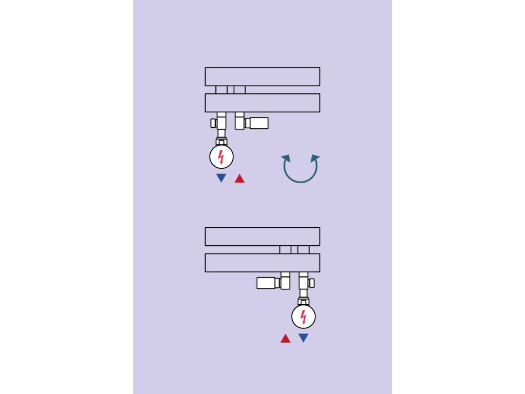 Pro kombinované topení musíte objednat RDINTEGSADA. + EL. TYČ v doporučeném výkonu, kterou můžete instalovat vlevo nebo vpravo skrz ventil do radiátoru (např. tyč RADPST...).