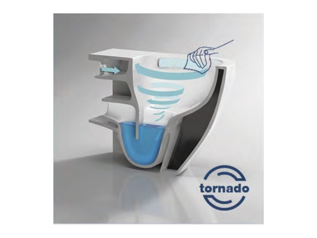Patentovaný systém Tornado s tryskou čistí celý vnitřní prostor s dosud nevídanou důkladností. Voda pod tlakem z trysky proniká vířivým pohybem do každého záhybu mísy. Tento systém splachování je nejen podstatně účinnější než běžné spádové splachování, ale také tišší a úspornější. Tradiční WC klozety mají pod okrajem velmi obtížně přístupná místa, v nichž se shromažďují nečistoty a bakterie. S inovativní technologií TORNADO byl tento problém vyřešen – ze záchodové mísy byl odstraněn vnitřní „límec“ a tedy i obtížně přístupná místa. Nyní při splachování voda oplachuje všechny vnitřní plochy mísy a snadno se také dostane ke všem vnitřním plochám, mísa je tak vždy dokonale čistá.