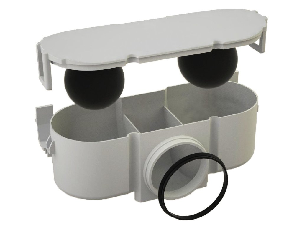• Dvojitá zápachová uzávěra, vodní sloupec a kulička. Tzn. V případě odpaření vody (podlahové topení,  nepoužívané byty atd.) kulička zaklapne otvor a zabraňuje vzlínání pachu