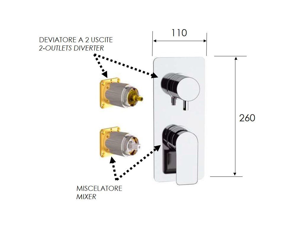 - Sprchová baterie podomítková, bez příslušenství, s přepínačem, 2 výstupy