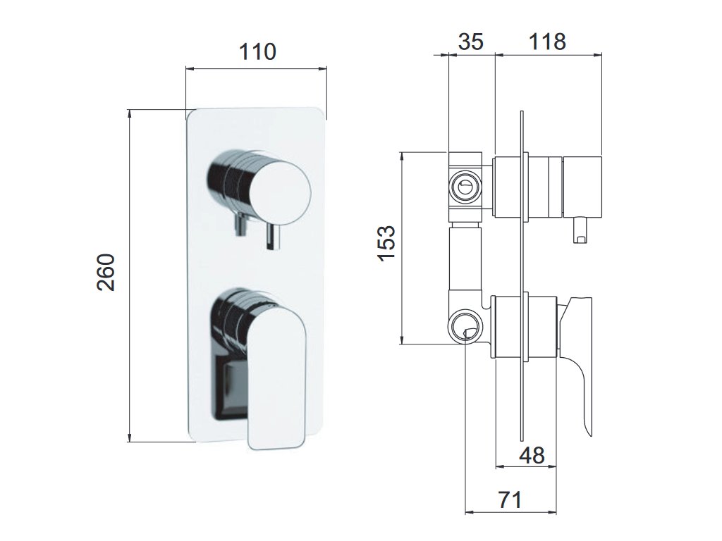 • Sprchová baterie podomítková, bez příslušenství, s přepínačem, 3 výstupy