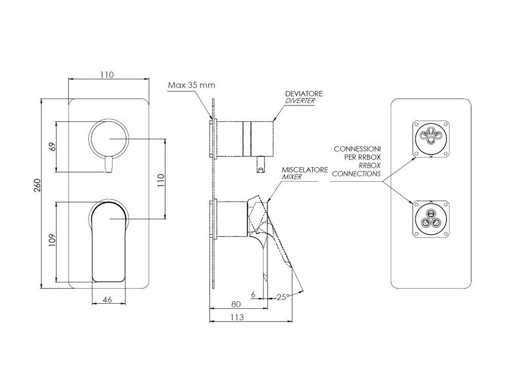 - Sprchová baterie podomítková, bez příslušenství, s přepínačem, 3 výstupy