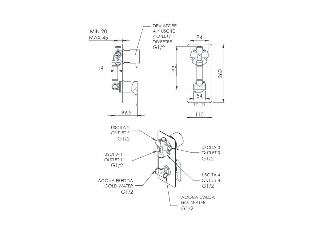 - Sprchová baterie podomítková, bez příslušenství, s přepínačem, 4 výstupy