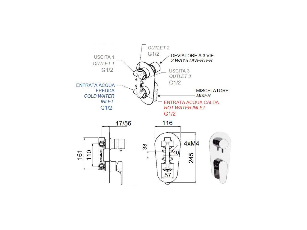 - Sprchová baterie podomítková, bez příslušenství, s přepínačem, 3 výstupy