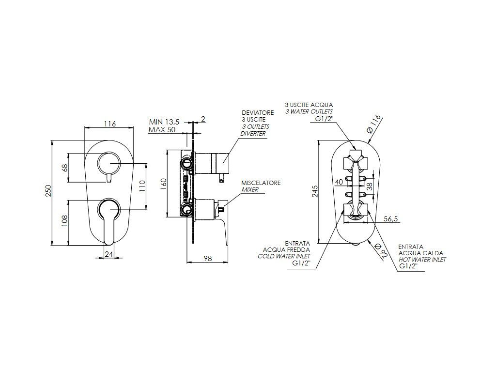 - Sprchová baterie podomítková, bez příslušenství, s přepínačem, 3 výstupy