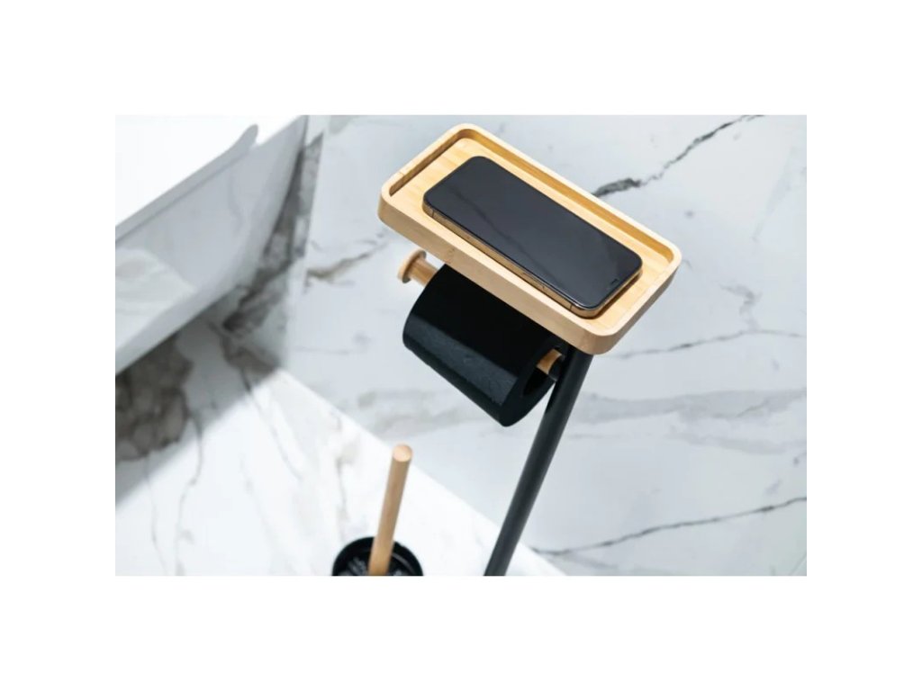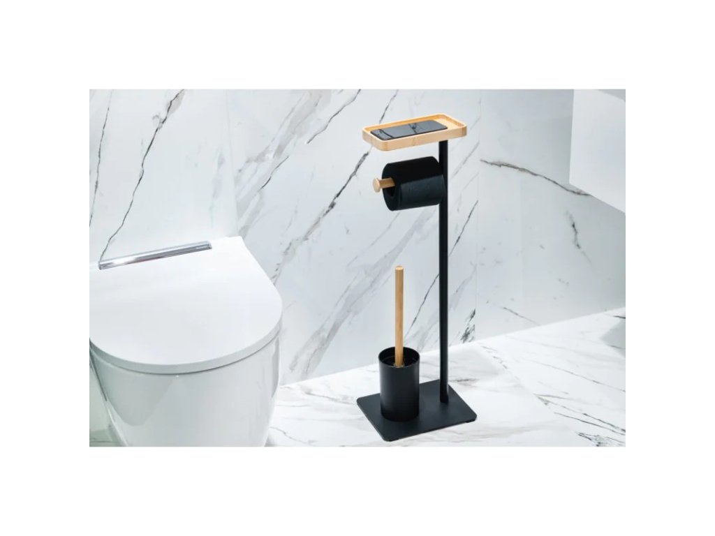 Koupelnový stojan vybavený WC štětkou a držákem na náhradní ruličky toaletního papíru. Je vyroben z kvalitní oceli lakované černě s matným povrchem. Má dekorativní prvky z přírodního bambusu. Koupelnový stojan je vybaven funkční, moderní policí na mobilní telefon nebo hygienické doplňky.
