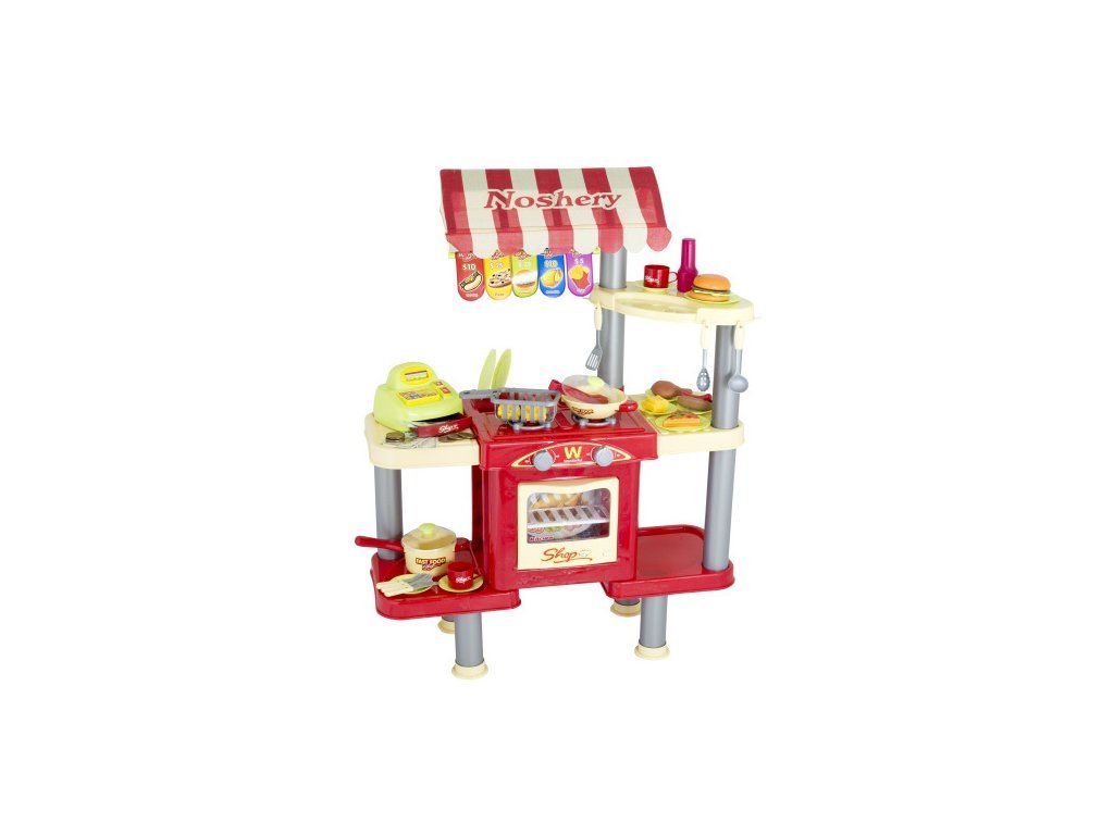 Dětský stánek s rychlým občerstvením je dětský set, kde budou malí prodejci obsluhovat své zákazníky. Je vybavený grilovaným kuřetem, hranolky, pizzou, hamburgrem, párky...Součástí stánku je trouba, sporák, myčka a také pokladna s penězi.Hračka není vhodná pro děti do 3 let!