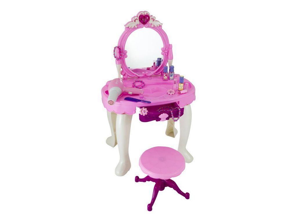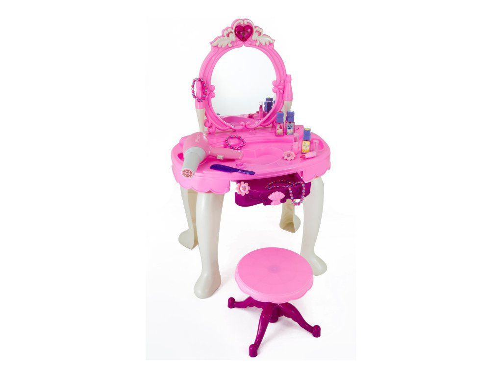 Toaletka má odkládací stolek se zásuvkou na poklady a velké zrcadlo. V něm se bude slečna shlížet na růžovobílé stoličce, která je otočná, aby se viděla ze všech stran. Zrcadlo je ozdobeno červeným srdcem, které po stisknutí hraje a svítí.