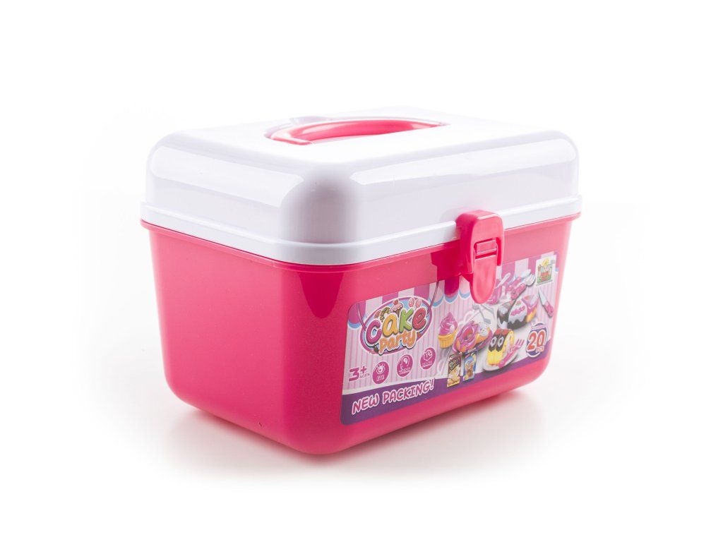 V kufříku najdete krásné barevné plastové dortíky, donuty, rolády, krabičky s ingrediencemi, nádobí i příbory. Zkrátka vše, co je v krámku s dobrotami potřeba. Součástí kufříku je také držadlo, díky kterému může mít vaše malá cukrářka svůj krámek s dortíky u sebe i na cestách.