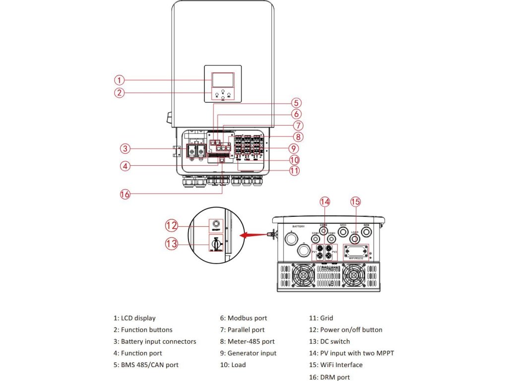 - Typ: Třífázový hybridní solární měnič