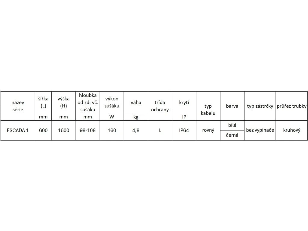 Instalprojekt Elektrický sušák ESCADA 1 Barva radiátoru - Černá matná, Rozměr radiátoru - 600 x 1600 mm, výkon 160 W RADESCE131