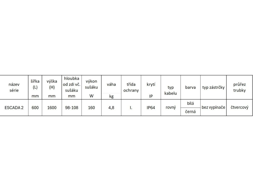 Instalprojekt Elektrický sušák ESCADA 2 Barva radiátoru - C34 bílá matná, Rozměr radiátoru - 600 x 1600 mm, výkon 160 W RADESCE234