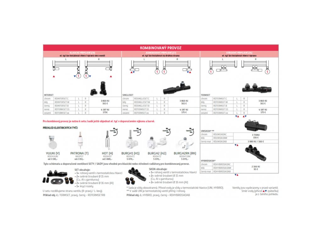 Radiátor lze objednat s příplatkovou výbavou Příplatek - Elektrický radiátor a díky tomu dostanete čistě elektrický radiátor (s již osazenou topnou tyčí HOT a naplněný speciální nemrznoucí teplonosnou směsí do otopných těles). Elektrické radiátory nejsou připojeny na rozvody TUV, snadno ho zapojíte pouze do elektrické zásuvky a užíváte si teplo v koupelně kdykoliv chcete.