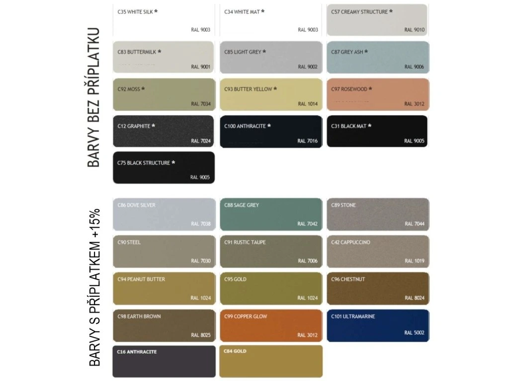 - barvy dle RAL jsou za příplatek 25% k ceně barev dle vzorníku