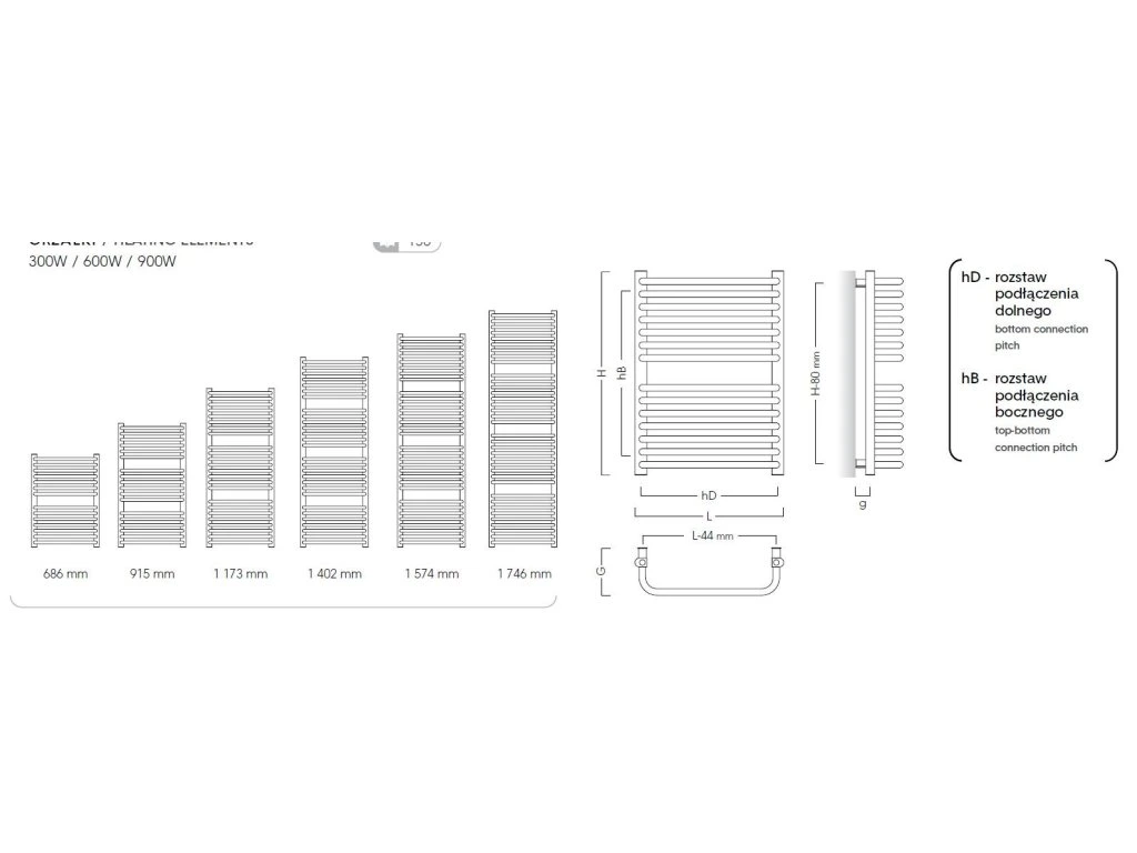 - 300 × 915 mm (boční připojení), výkon 400 W (topná tyč 400 W)
