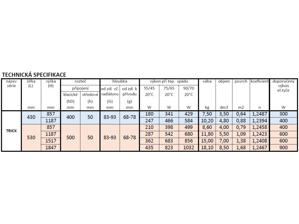 • 530 × 1187 mm, výkon 542 W, (topná tyč 600 W)
