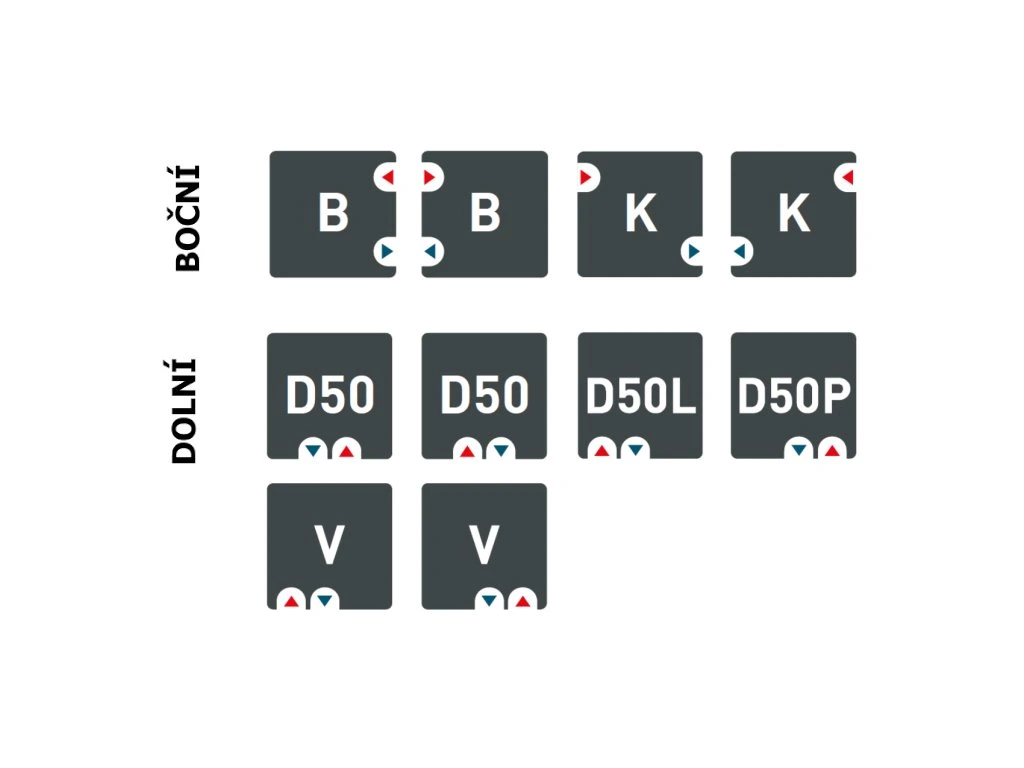 Radiátor je dodáván jak s bočním, tak i se spodním připojením D50. U spodního D50 je připojení standardně umístěno ve středu radiátoru, ale lze i případně nechat vyrobit s umístěním na pravé nebo levé straně radiátoru (nutno uvést do objednávky). Standardní barva C35 white silk (bílá lesklá).