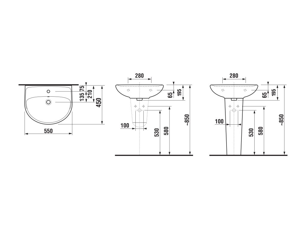 Umyvadlo, rozměr 55x45 cm, materiál sanitární keramika, barva bílá, s přepadem, otvor pro baterii uprostřed. Možno instalovat samostatně na stěnu, v kombinaci s krytem sifonu nebo sloupem.