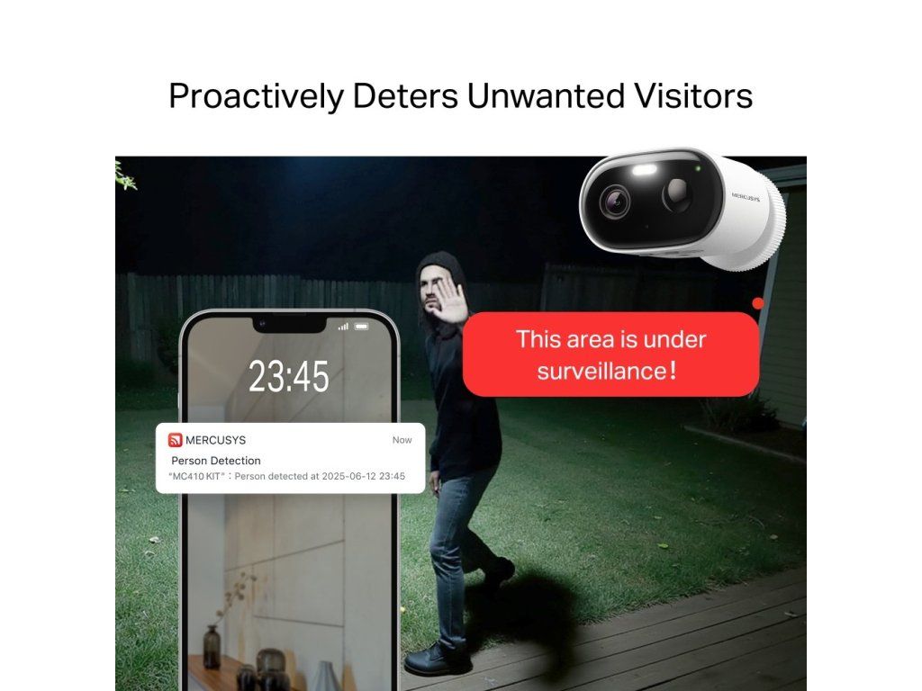 Mercusys MC410 KIT je venkovní bezpečnostní IP kamera se solárním napájením, která nabízí rozlišení 2K 3 MP, inteligentní detekci osob a plně bezdrátovou instalaci. Díky vestavěné baterii 5200 mAh, solárnímu panelu a odolnosti IP65 poskytuje spolehlivé zabezpečení domu, zahrady nebo firmy bez nutnosti kabelů.