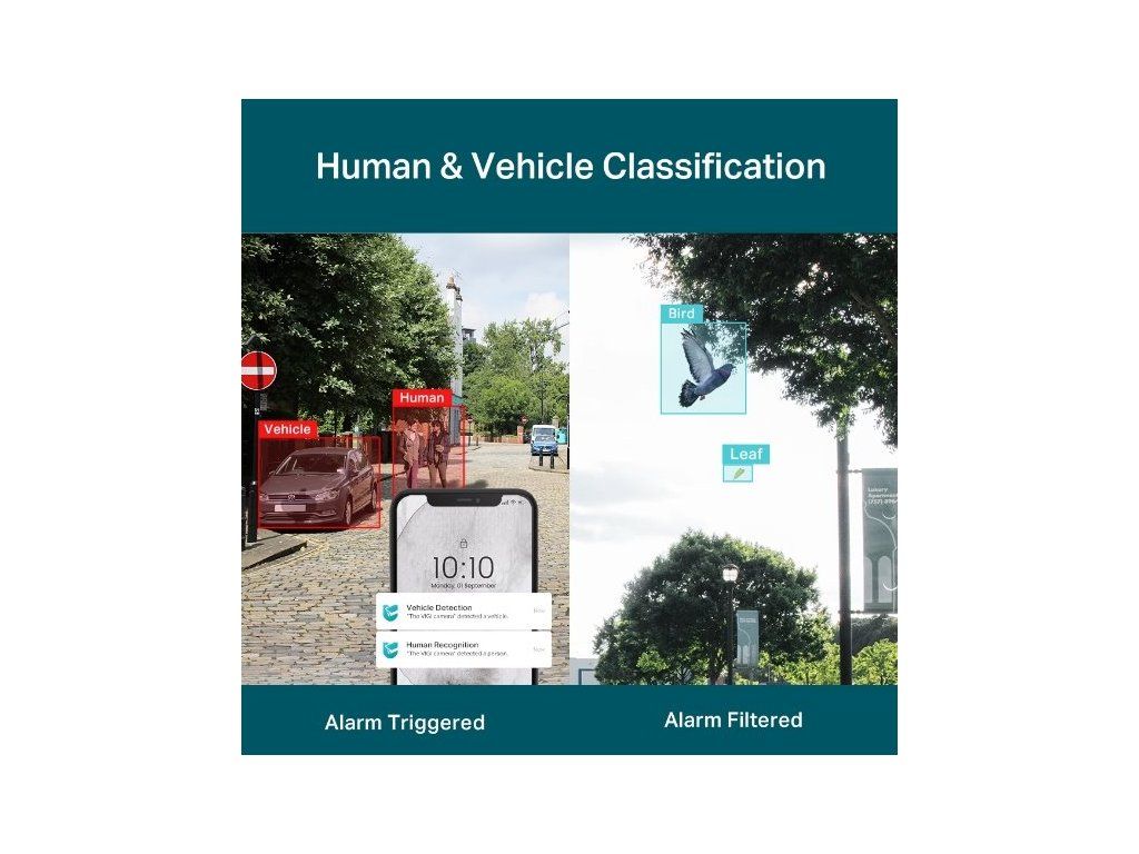 Kamera TP-Link VIGI monitoruje své okolí a díky pokročilým algoritmům dokáže rozlišit lidi a vozidla od ostatních objektů. Pokud chcete dostávat oznámení jen v některých případech, spustíte pouze detekci lidí či vozidel (nebo detekci vozidel i lidí). Kamera nebude reagovat na padající listí a na poletující ptáky.