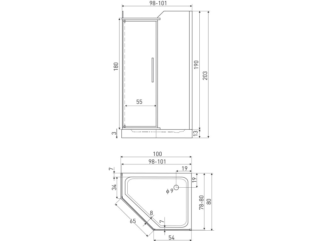 - rozměry sprchového koutu - 100 x 80 x 203 cm (včetně sprchové vaničky)