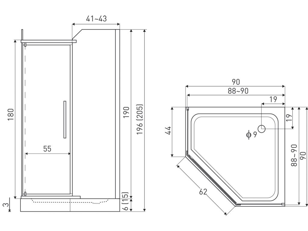 - rozměry sprchového koutu - 90 x 90 x 190 cm