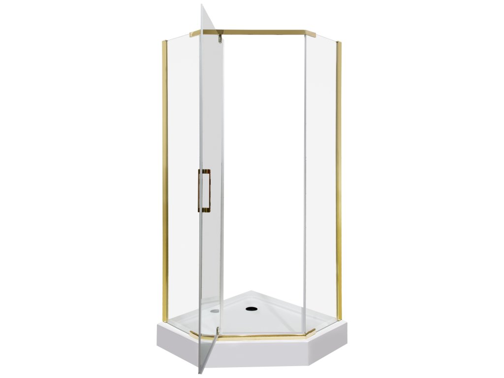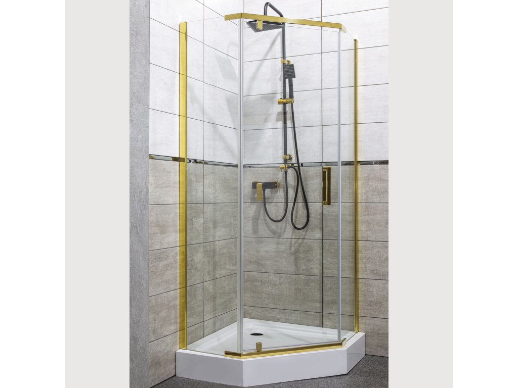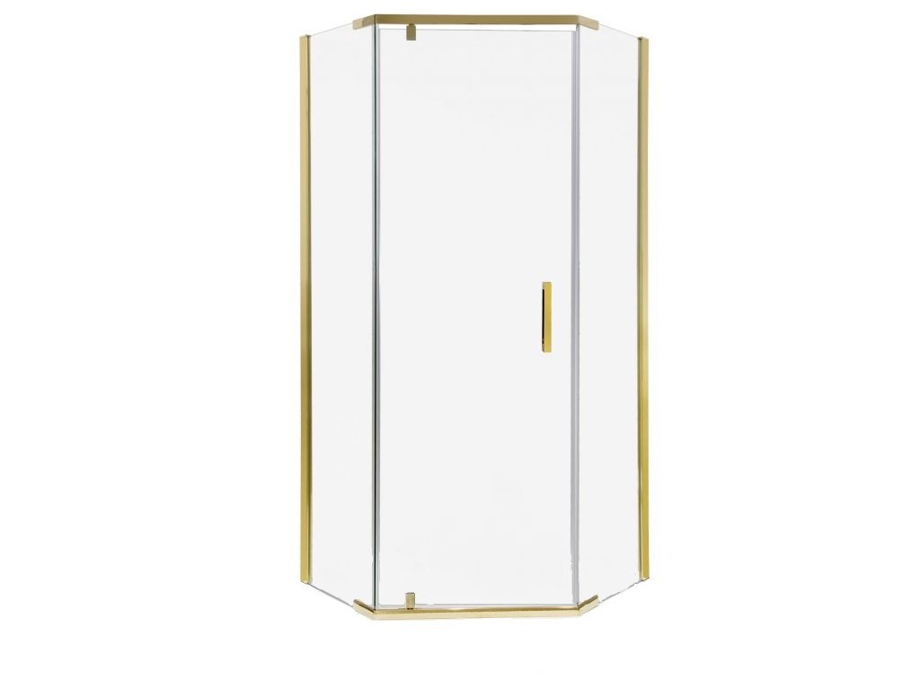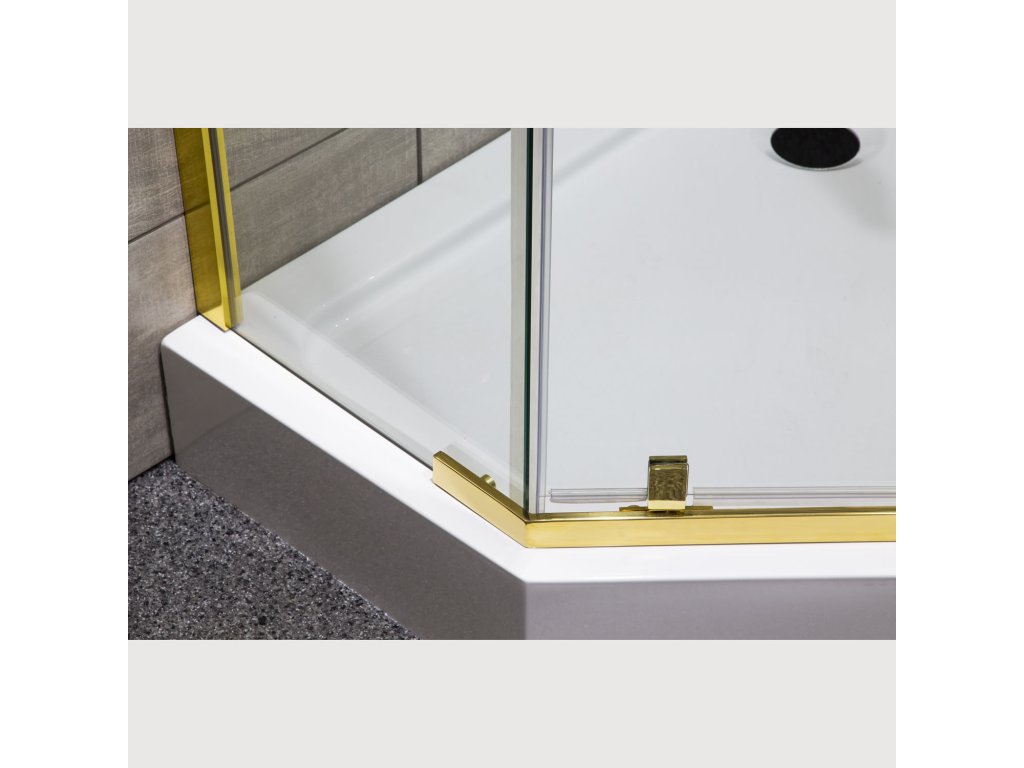 Luxusní zpracování designového sprchového koutu v profilu ve zlatých barvách a ojedinělém pětihranném tvaru dodá Vaší koupelně na zcela novém a moderním vzhledu. Sprchový kout je vyroben z kvalitního tvrzeného čirého skla o síle 6 mm, zároveň je sklo opatřeno nátěrem PROTECT, který zabraňuje usazování nečistot a nežádoucích map stékajících po skle. Díky univerzálnímu montážnímu systému, lze namontovat dle potřeby na pravou nebo levou variantu.