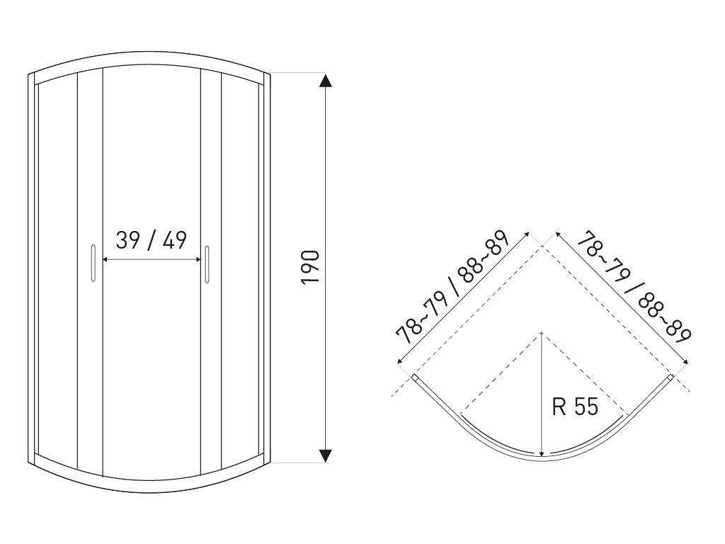 - čtvrtkruhové provedení - dvoukřídlé dveře s ložiskovým systémem otevírání (posuvné)