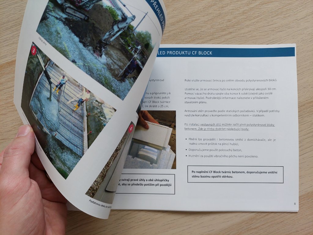 Bazény CF Block jsou bazény nové generace určené primárně pro zákazníky, kteří si chtějí bazén postavit sami a hledají jednoduché ale kvalitní řešení. Bazény CF Block jsou dodávány v kompletních sadách, které obsahují veškeré potřebné příslušenství pro stavbu a provoz bazénu a novému majiteli tak odpadá nutnost shánět každé příslušenství zvlášť. Součástí dodávky je podrobný návod na stavbu bazénu a instalaci příslušenství.