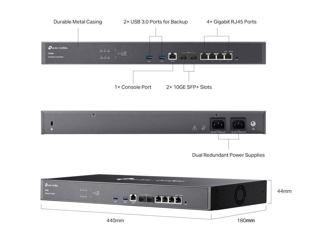 Kontroler TP-Link OC400 je vybavený dvěma 10GE SFP+ porty, čtyřmi GE RJ45 a 2 USB 3.0 porty. O spolehlivost sítě se postarají záložní napájecí zdroje. Podporuje totiž dvojité redundantní napájení.