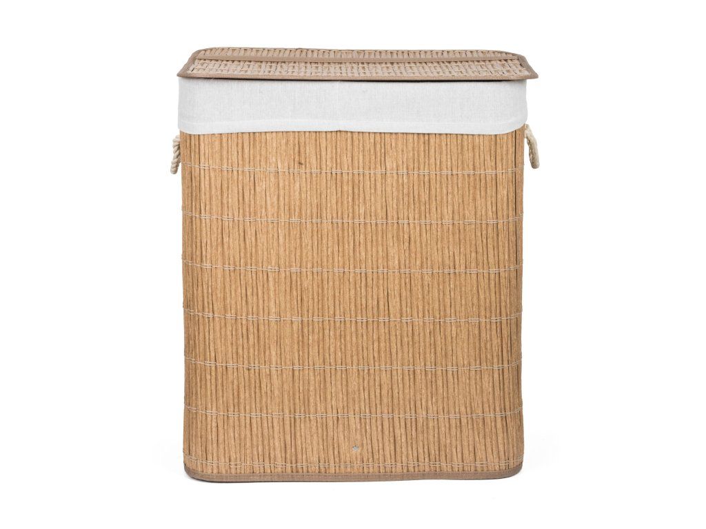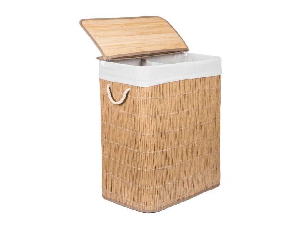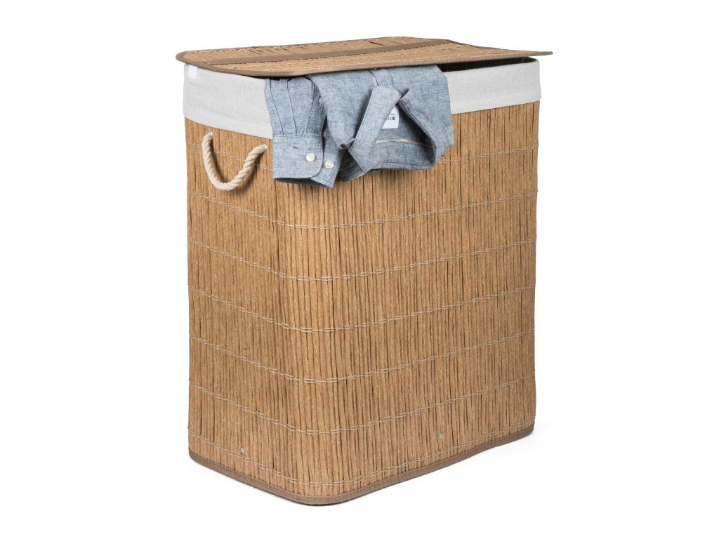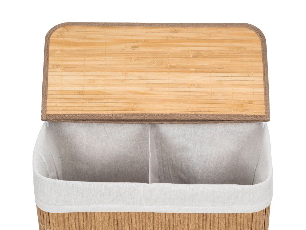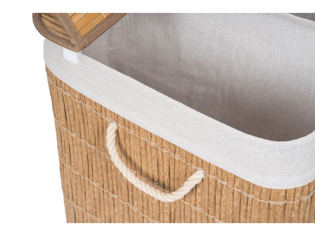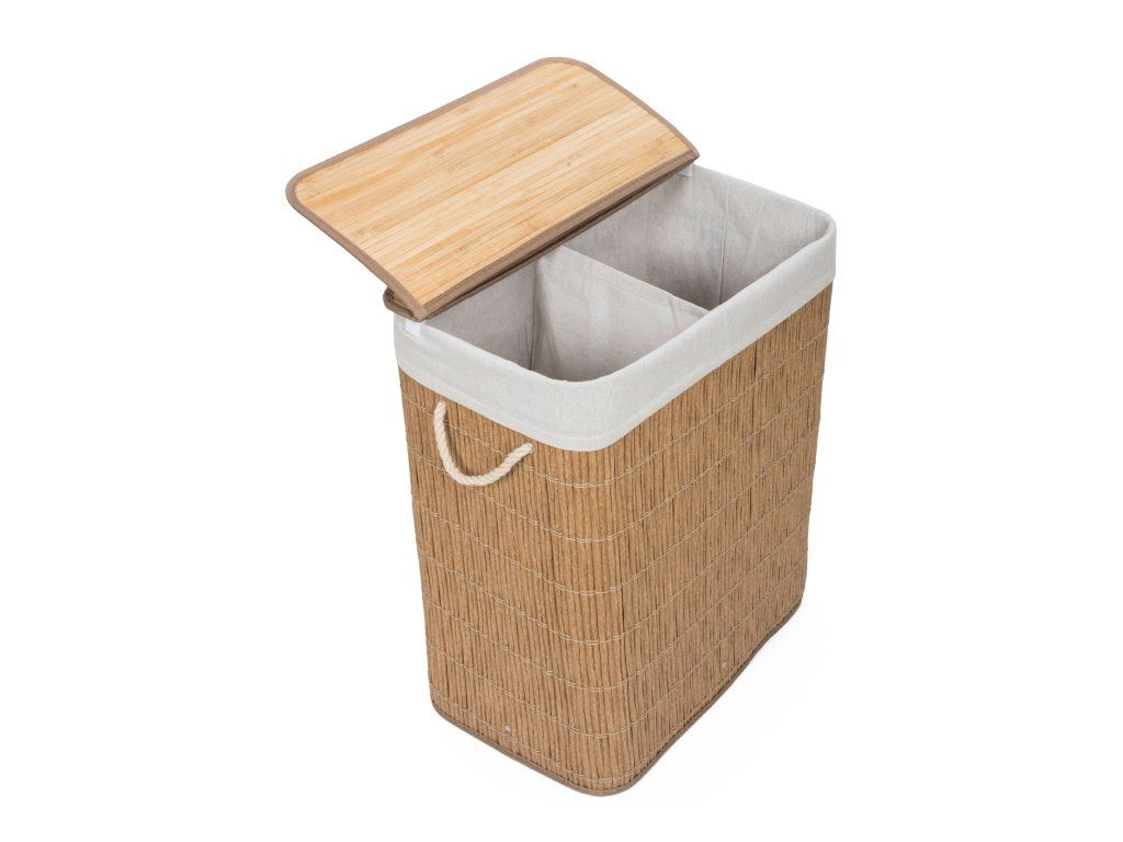 Koš na prádlo G21 z PE ratanu s pevným víkem má pratelnou látkovou vložku, rozdělenou na dva samostatné oddíly. Špinavé prádlo tak můžete třídit už před praním a umístit zvlášť kousky podle materiálu nebo barvy.