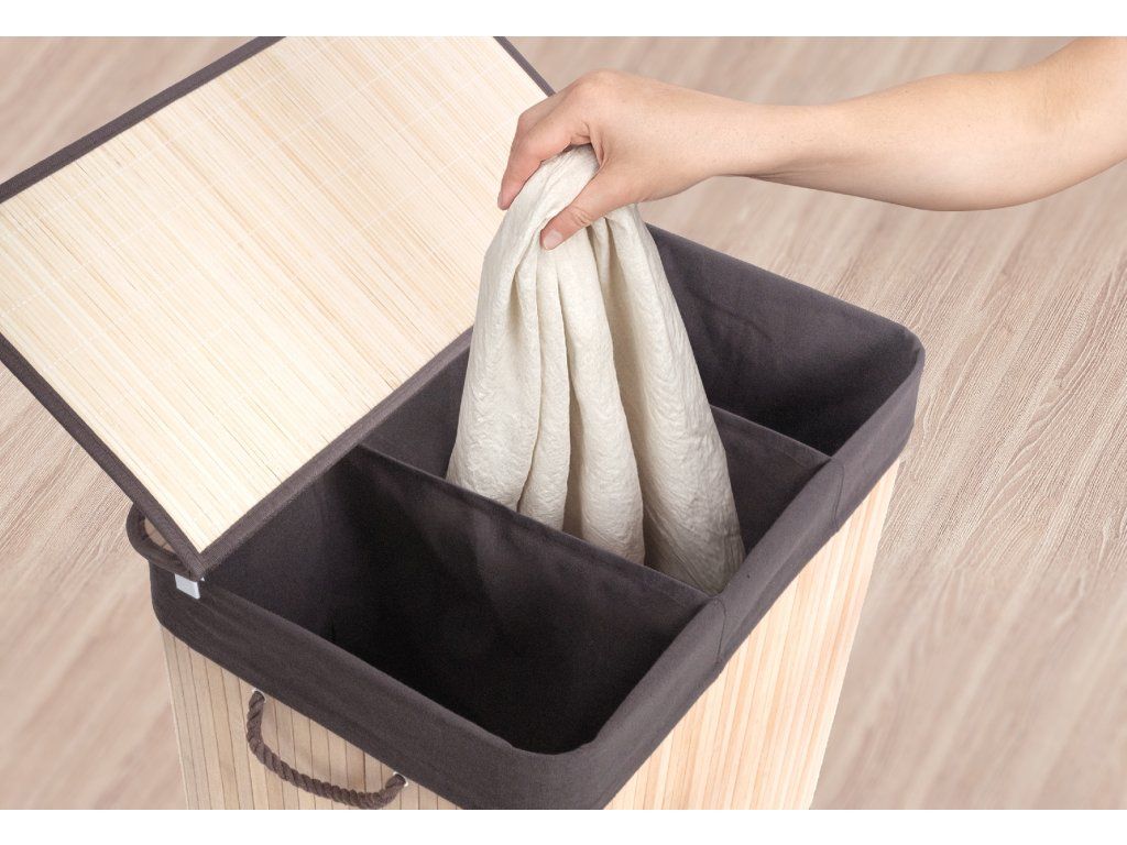 Bambusový koš G21 s pevným víkem má pratelnou látkovou vložku, rozdělenou na tři samostatné oddíly. Špinavé prádlo tak můžete třídit už před praním a umístit zvlášť kousky podle materiálu nebo barvy.