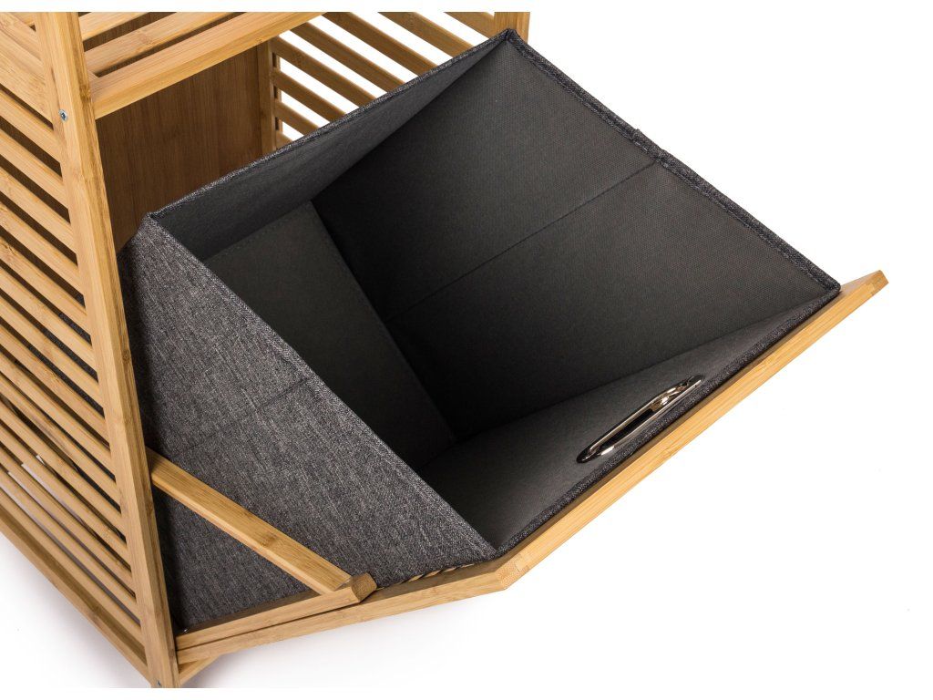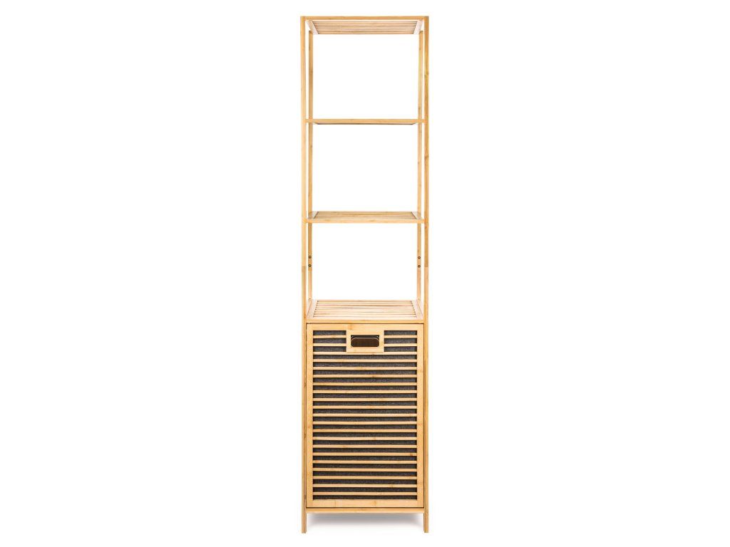 Praktický stojan se 4 policemi a výklopným košem na prádlo je skvělým řešením. Ušetří spoustu místa a uložíte do něj vše, co potřebujete. Potřeby na praní nebo kosmetiku, koupelnové vybavení a ručníky nebo úklidové prostředky. Každá z polic unese až 10 kg zátěže. Jedna z nich tvoří zároveň víko koše na špinavé prádlo s látkovou vložkou ve spodní části stojanu.