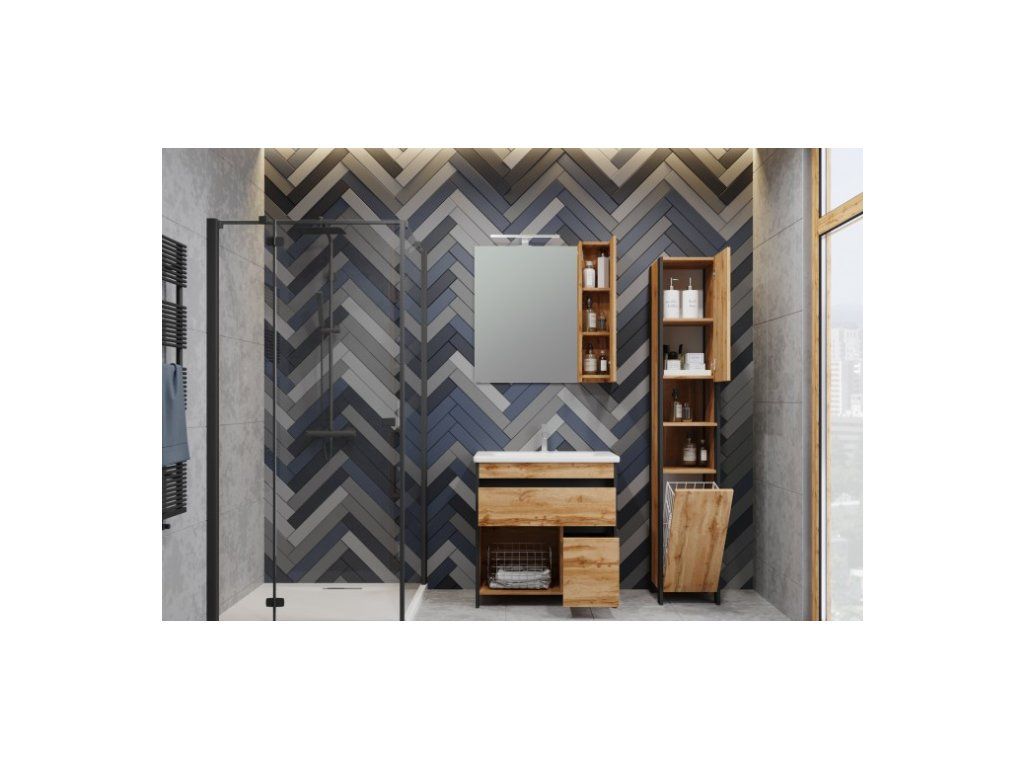 Koupelnová skříňka Bronx Wotan Oak 80 pracuje s kontrastem: teplý, matný dekor dubu Wotan a černé masivní stojny z borovice. Výsledkem je vyvážený kus nábytku, který působí kompaktně, ale vizuálně lehce.