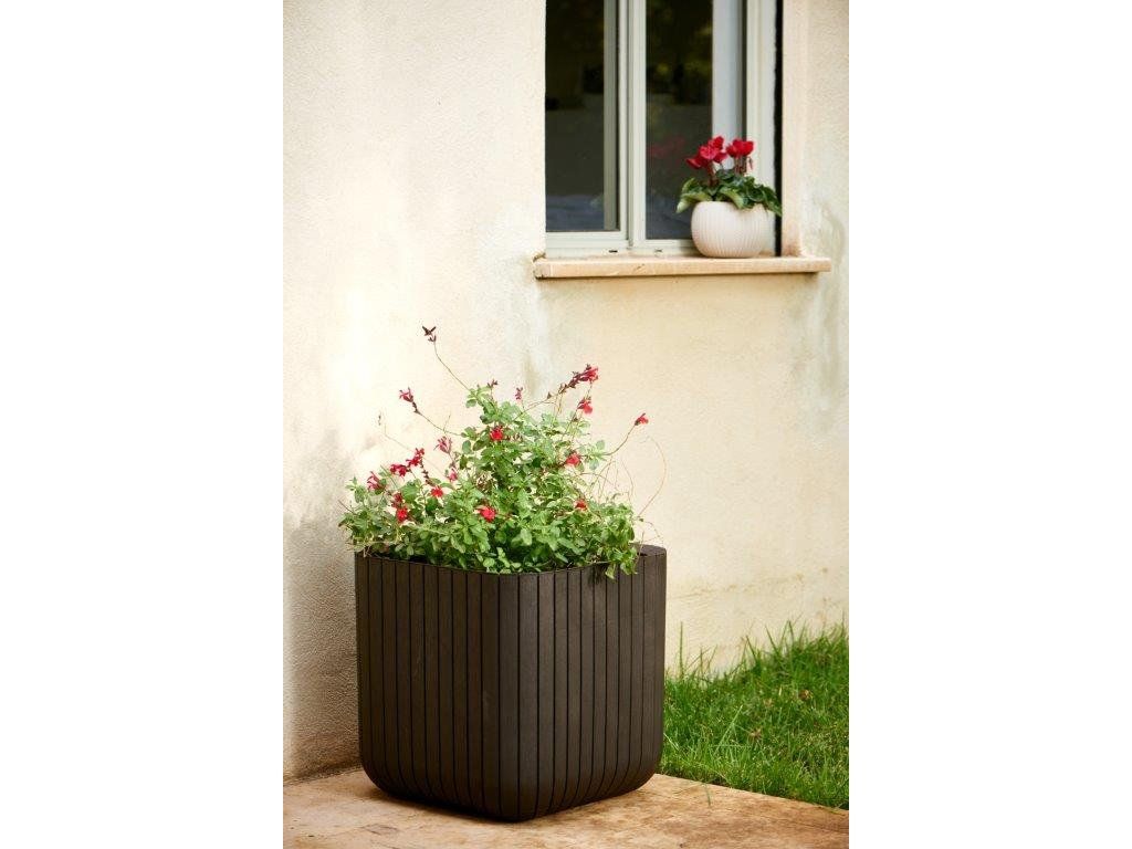 Květináč Keter Cube Planter M v elegantní hnědé barvě zaujme věrnou imitací přírodního dřeva a odolnou konstrukcí z lisovaného plastu. Díky objemu 50,5 litru se hodí pro pěstování větších rostlin na zahradě, terase i balkonu.