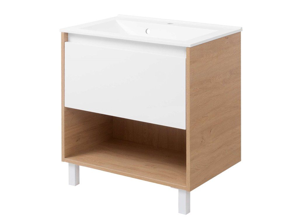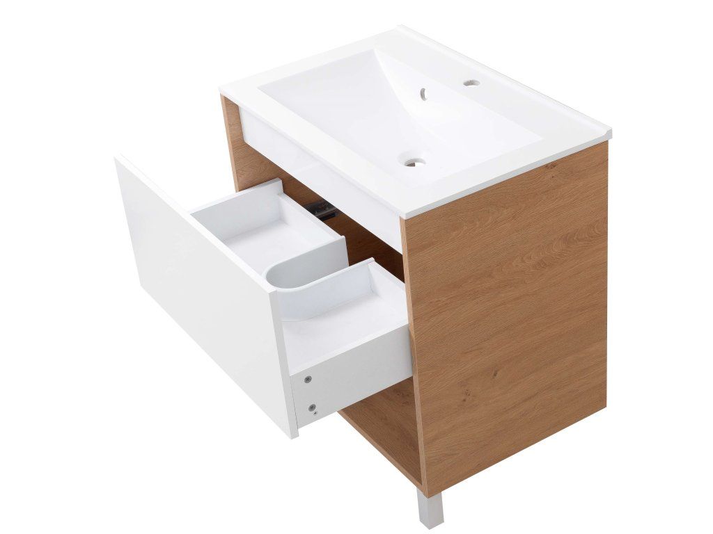 Představujeme Vám luxusní koupelnový nábytek, který zaujme především svým zajímavým provedením. Tato naprosto designová skříňka s umyvadlem by rozhodně neměla chybět v žádné moderní stylové koupelně. Boční strany skříňky a celá konstrukce jsou vyrobeny z MDF desky o tloušťce 16mm. Umyvadlo, které je součástí skříňky, je vyrobeno z vysoce kvalitního a oblíbeného litého mramoru. Povrchová úprava je řešena bílou barvou a dekorem dřeva. Velikou výhodou této skříňky je její soft close dovírání, díky kterému bude užívání skříňky naprosto pohodlné. Pociťte výhody a úložný prostor, který Vám tato skříňka dopřeje.