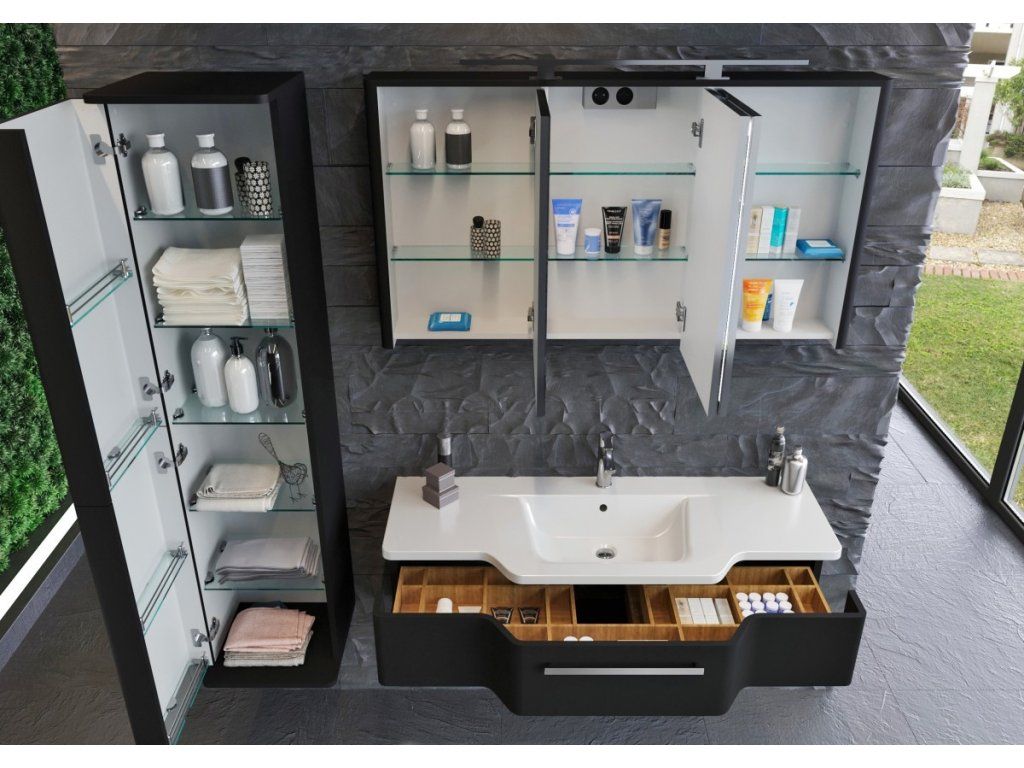 Luxusní a vysoce kvalitní koupelnový nábytek, který svým precizním provedením nadchne úplně každého. Levanto designová zrcadlová skříňka by rozhodně neměla chybět v žádné stylové koupelně. Skříňka je vyrobena z vysoce kvalitní MDF desky o síle 19 mm. Levanto je obohaceno o LED osvětlení v podobě podlouhlého osvětlení nad skříňkou a zároveň tak v podobě podsvícení samotného zrcadla. Povrchová úprava je řešena černým matným nátěrem Taktus, což značí sametově hebký dotek (připomíná gumu). Obrovskou výhodou této skříňky je její soft close dovírání, díky kterému bude užívání skříňky naprosto pohodlné. Pociťte výhody a úložný prostor, který Vám tato skříňka dopřeje.