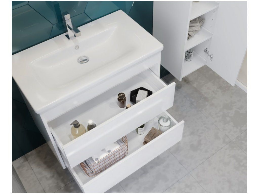 Představujeme Vám zcela nový luxusní koupelnový nábytek, který nadchne úplně každého. Tato naprosto designová skříňka s umyvadlem by rozhodně neměla chybět v žádné moderní koupelně. Skříňka je vyrobena z dřevotřísky o síle 16 mm. Umyvadlo, které je součástí skříňky, je vyrobeno z velice kvalitní sanitární keramiky. Povrchová úprava je řešena bílou lesklou barvou. Velkou výhodou této skříňky je její soft close dovírání, díky kterému bude užívání skříňky naprosto pohodlné. Pociťte výhody a úložný prostor, který Vám tato skříňka dopřeje.