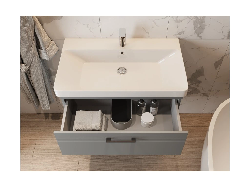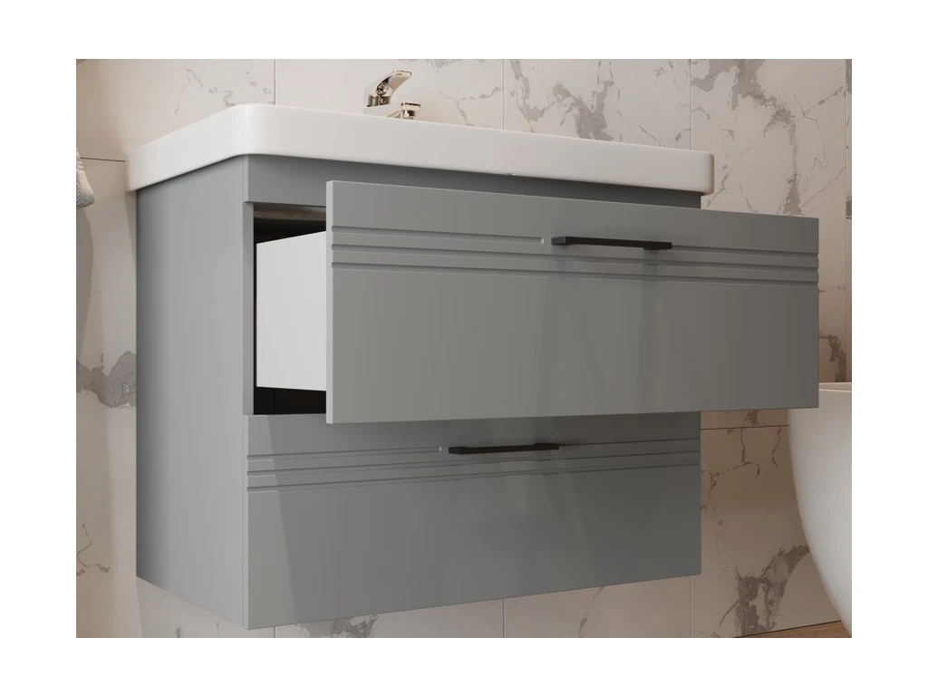 Luxusní a designová koupelnová skříňka včetně keramického umyvadla dovede Vaši koupelně k naprosté dokonalosti. Skříňka Melody je vyrobena tak, aby byl její úložný prostor, co nejvíce využitý. Obsahuje dvě zásuvky (šuplíky), do kterých se vejde spoustu věcí, včetně vyšších nádob. Zásuvky jsou zdobeny designovými úchyty v černé barvě, díky kterým bude ladění koupelny o kus jednodušší - doplňte svou koupelnu například o černou umyvadlovou baterii!